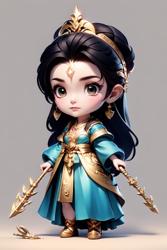 <lora:AgainGameLora:0.7>, 1girl, solo, chibi, full body, jewelry, white background, dress, standing, earrings, hold,weapon,spear
