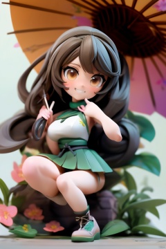 ((HRD, HUD, 8K)),((masterpiece, best quality)), highly detailed,1girl, yamato (kancolle), long hair, solo, umbrella, ponytail, skirt, brown hair, very long hair, hair ornament, thighhighs, breasts, oil-paper umbrella, flower, single thighhigh, hair flower, detached sleeves, sitting, brown eyes, large breasts, headgear, cherry blossoms, red umbrella, smile, looking at viewer, miniskirt, pleated skirt,Xguofengshouban, blind box effect