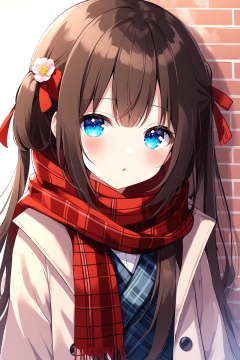 1girl, loli, solo, long hair, looking at viewer, blush, blue eyes, brown hair, black hair, flower, scarf, coat, plaid, red scarf, plaid scarf