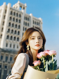 jiFilm,flower,1girl,brown hair,bouquet,long hair,sky,outdoors,jewelry,day,earrings,holding,solo focus,looking at viewer,pink flower,lips,building,<lora:20240611-1718040971673:1>,, (masterpiece, best quality, highres:1.2),