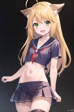 masterpiece, best quality, masterpiece,best quality,official art,extremely detailed CG unity 8k wallpaper,black_background,bandeau,1girl, solo, long hair, flat chest, looking at viewer, bangs, blonde hair, navel, animal ears, green eyes, cowboy shot, midriff ,collarbone, animal ear fluff,ahoge,bare arms,sailor shirt,pleated skirt,school uniform,midriff,navel,collarbone,black thighhighs, :d,chest binder,tsss