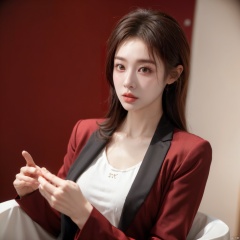 Girl, suit, pretty face, (photo reality: 1.3) , Edge lighting, (high detail skin: 1.2) , 8K Ultra HD, high quality, high resolution, best ratio four fingers and one thumb, (photo reality: 1.3) , wear a red suit jacket, white shirt inside, large breasts, solid color background, solid red background, high-grade feeling, texture pull full, 1 girl,Xlongni, desert_sky, hanfu