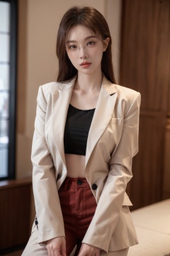 Girl, suit, pretty face, (photo reality: 1.3) , Edge lighting, (high detail skin: 1.2) , 8K Ultra HD, high quality, high resolution, best ratio four fingers and one thumb, (photo reality: 1.3) , wear a red suit jacket, white shirt inside, large breasts, high-grade feeling, texture pull full, 1 girl,Xlongni, Frameless glasses,(big_breasts)