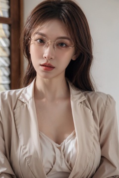 Xlongni,1Girl, suit, (photo reality: 1.3) , Edge lighting, (high detail skin: 1.2) , 8K Ultra HD, high quality, high resolution, (photo reality: 1.3) , wear a pink suit jacket, white shirt inside, large breasts, high-grade feeling, texture pull full, 1 girl,Xlongni, (Frameless glasses:1.29),(big_breasts:1.29)