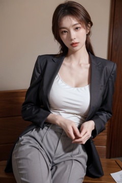 Xlongni,1Girl, suit, (photo reality: 1.3) , Edge lighting, (high detail skin: 1.2) , 8K Ultra HD, high quality, high resolution, (photo reality: 1.3) , wear a purple suit jacket, white shirt inside, large breasts, high-grade feeling, texture pull full, 1 girl,Xlongni,(big_breasts:1.39)