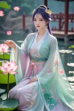 (((purple hair))),(Sitting on the lotus pond porch:1.49) ,(A pond full of pink lotus flowers:1.5),close up of 1girl,Hairpins,hair ornament,hair wings,slim,narrow waist,perfect eyes,beautiful perfect face,pleasant smile,perfect female figure,detailed skin,charming,alluring,seductive,erotic,enchanting,delicate pattern,detailed complex and rich exquisite clothing detail,delicate intricate fabrics,