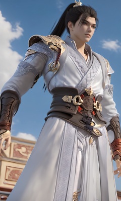 professional 3d model Shihao,front view of a man with a black high ponytail hair,(bare abdominal muscles:1.3),(absolute_territory:1.2),full body,blue sky,white lightning effects on hands,(white dress:0.7),<lora:Perfect Shihao-000019>,shiny,reflective skin, . octane render, highly detailed, volumetric, dramatic lighting
