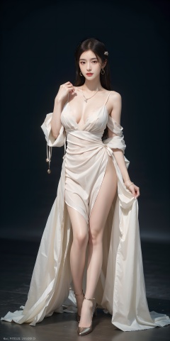 1girl, solo, realistic, jewelry, necklace, dress, breasts, earrings, lips, full body:2,simple background, looking at viewer, medium breasts, makeup,fashion model,picture-perfect face,flowing hair,shiny skin,,(Shooting background board,photostudio),(simple),(masterpiece, top quality),master piece,professional artwork,famous artwork,(realistic,photorealistic:1.37) ,HDR,UHD,8K, ultra realistic 8k cg,8K, 32k,HD, <lora:abel好看的姿势:0.6> <lora:abel光艺术:0.1> <lora:YFilter_BeautyFace_CN_V1:0.35>