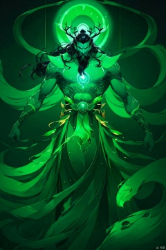 solo,long hair,black hair,1boy,full body,male focus,glowing,colored skin,floating,antlers,green skin,green theme,orb,