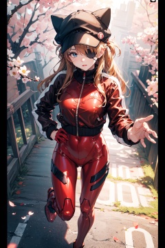 <lora:Asuka-000018:0.8>,Asuka CYQL,1girl,looking at viewer,solo,long hair,blue eyes,interface headset,brown hair,orange hair,hair between eyes,two side up,medium breasts,(plugsuit,eyepatch,hat,jacket,animal hat,bodysuit,red jacket,track jacket,cat hat,black headwear,bodysuit under clothes,red bodysuit,hat ornament,long sleeves,zipper,turtleneck),(moaning:1.2),beautiful face,beautiful eyes,glossy skin,shiny skin,(panorama,from_above,on stomach:1.2),outstretched hand,Cherry blossoms, Country lane, Blossom petals, Springtime charm, Rural tranquility, Cherry blossom drift,Daffodils,beautiful detailed sky,beautiful detailed glow,(English text:1.3),(border:1.5),posing in front of a colorful and dynamic background,(masterpiece, best quality, beautiful and aesthetic:1.3),contrapposto,female focus,fine fabric emphasis,wallpaper,fashion,Lipstick,depth of field,intricate_detail,finely_detailed,fine_fabric_emphasis,(glossy),<lora:增强减少细节add_detail:0.3>,