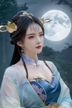 masterpiece,(best quality),1girl,Xtianqiong,flower,(big breasts:1.59),full moon, ,chinese woman, traditional chinese ink painting,hanfu