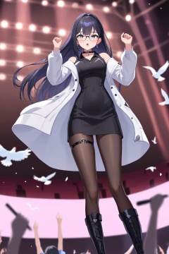 sinuo,1girl,long white coat,long hair,boots,(black shirt:1.2),glasses,looking at viewer,black-framed eyewear,jewelry,thigh strap,black pantyhose,earrings,smile,choker,bare shoulders,black hair,<lora:zhijiang-sinuo-000004:0.5>,masterpiece,best quality,(pencil_dress:1.1),(collared_dress:1.2),stage,stage lights,birds,blurry background,blurry foreground,open clothes,from below,dancing,hands up,:o