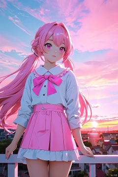 vibrant colors, 1girl, masterpiece, sharp focus, best quality, depth of field, cinematic lighting, long hair, pink hair, twin tail, pink eyes, Light blue outfit, landscape, sunset, pink sky, town
