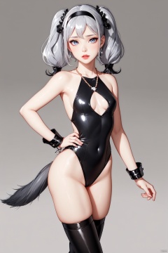 Realistic style, cinematic work, 8K wallpaper, masterpiece, very realistic quality, best quality, masterpiece, high-level, high-resolution,,,Edge lighting, dual tone lighting, soft lighting, The illuminated surface of the material has bright spots and highlights, which flicker and have a mirror effect when reflected, There are sparkling spots on the armor,,,1 girl, mature female, solo, full body, looking at viewer, lace, strong rim light, Standard proportion of female body, golden proportion of female body,,,Standing, standing posture, Sexy full body standing posture,,,,(U522, 1girl, hairband, twintails, low twintails, long hair, blue eyes, grey hair, bangs, tail, blush, floating hair, hair ornament, thighhighs, breasts, boots, small breasts, bare shoulders, black footwear, swimsuit, one-piece swimsuit, wrist cuffs, black thighhighs, high heels, symbol-shaped pupils, black hairband, leotard, wristband, white one-piece swimsuit, clothing cutout, :1.2),,colorful,(detailed skin: 1.3), (detailed face: 1.3),clear focus,delicate,(mature women: 1.2),(glossy skin+glossy skin: 1.4),(sweating: 1.1),(big_eyes),red_ eyeshadow,long_ Eyelashes, red lips,,,simple background, grey background,,,(Diamond hair accessories, diamond necklaces, diamond earrings, diamond earrings, clothes embedded with diamonds, armor embedded with diamonds,:1.3),, , U522<lora:EMS-326231-EMS:0.260000>
