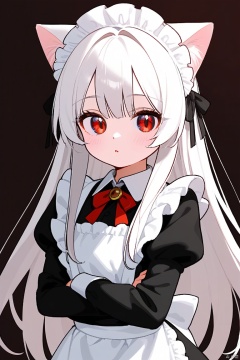 1girl, loli,solo,white hair,long hair,bangs,red eyes,maid,maid headdress,cat ears,,, meme,,upper_body, overexpression, , Random emotion,