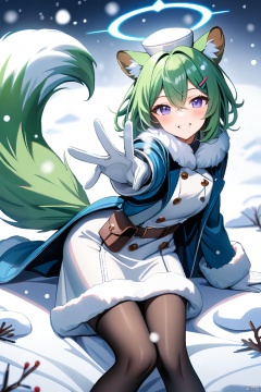 masterpiece, best quality, 1girl,halo, solo, tail, smile, fur trim, gloves, blush, hairclip, hat, looking at viewer, grey gloves, reaching towards viewer, weasel ears, reaching, grin, weasel tail, lying, purple eyes, snow, long sleeves, hair ornament, snowing, blue halo, hair between eyes, flask, on back, green hair, jacket, outstretched arms, pantyhose, short hair, coat, pouch, grey headwear, white gloves, blue eyes, fur-trimmed coat, feet out of frame,
