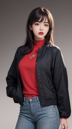 1girl, bangs, breasts, brown_eyes, brown_hair, gradient, gradient_background, grey_background, jacket, lips, long_sleeves, looking_at_viewer, nose, realistic, red_jacket, red_lips, solo, sweater, upper_body