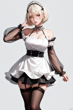 Realistic style, cinematic work, 8K wallpaper, masterpiece, very realistic quality, best quality, masterpiece, high-level, high-resolution,,,Edge lighting, dual tone lighting, soft lighting, The illuminated surface of the material has bright spots and highlights, which flicker and have a mirror effect when reflected, There are sparkling spots on the armor,,,1 girl, mature female, solo, full body, looking at viewer, lace, strong rim light, Standard proportion of female body, golden proportion of female body,,,Standing, standing posture, Sexy full body standing posture,,,,(jinqu, 1girl, yellow eyes, short hair, white hair, blonde hair, bangs, dark skin, dark-skinned female,thighhighs, white thighhighs, maid headdress, maid, dress, sleeves past wrists, apron, bare shoulders, red ribbon, breasts, maid apron, black dress, detached collar, frills, wide sleeves, ribbon, black footwear, long sleeves, round eyewear, shoes,:1.2),,bare shoulders, off shoulder, black hairband, bikini bottom only, short dress, swimsuit, pleated dress, bikini, floating hair, blush, ass visible through thighs, skirt,White high-heeled shoes,:1.2),,,colorful,(detailed skin: 1.3), (detailed face: 1.3),clear focus,delicate,(mature women: 1.2),(glossy skin+glossy skin: 1.4),(sweating: 1.1),(big_eyes),red_ eyeshadow,long_ Eyelashes, red lips,,,simple background, grey background,,,(Diamond hair accessories, diamond necklaces, diamond earrings, diamond earrings, clothes embedded with diamonds, armor embedded with diamonds,:1.3), jinqu<lora:EMS-326474-EMS:0.200000>