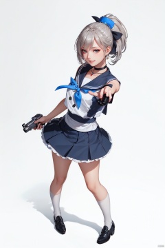 Realistic style, cinematic work, 8K wallpaper, masterpiece, very realistic quality, best quality, masterpiece, high-level, high-resolution,,,Edge lighting, dual tone lighting, soft lighting, The illuminated surface of the material has bright spots and highlights, which flicker and have a mirror effect when reflected, There are sparkling spots on the armor,,,1 girl, mature female, solo, full body, looking at viewer, lace, strong rim light, Standard proportion of female body, golden proportion of female body,,,Standing, standing posture, Sexy full body standing posture,,,,(huoqiangshou, 1girl, socks, skirt, bow, choker, sailor collar, black choker, star, torpedo, white socks, blue bow, handgun, shirt, shoes, collarbone, white shirt, loafers, mini hat, hat, sleeveless, blue ribbon, tilted headwear, pleated skirt, kneehighs, frills, white skirt, anchor symbol, buttons, sidelocks, blue sailor collar, blue neckerchief, chick, neckerchief, teeth, ribbon, miniskirt, frilled skirt, bag, blue choker, shiny, sleeveless shirt, striped, gun, weapon, turret, cannon, machinery, anchor, revolver, rigging, torpedo tubes, one eye closed, smile, holding, holding gun, holding weapon, grin, looking at viewer, pointing at viewer, outstretched arm, knees together feet apart, aiming at viewer, finger on trigger, solo, white background, full body, simple background, :1.4),,bare shoulders, off shoulder, black hairband, bikini bottom only, short dress, swimsuit, pleated dress, bikini, floating hair, blush, ass visible through thighs, skirt,White high-heeled shoes,:1.2),,,colorful,(detailed skin: 1.3), (detailed face: 1.3),clear focus,delicate,(mature women: 1.2),(glossy skin+glossy skin: 1.4),(sweating: 1.1),(big_eyes),red_ eyeshadow,long_ Eyelashes, red lips,,,simple background, grey background,,,(Diamond hair accessories, diamond necklaces, diamond earrings, diamond earrings, clothes embedded with diamonds, armor embedded with diamonds,:1.3), huoqiangshou<lora:EMS-325739-EMS:0.290000>