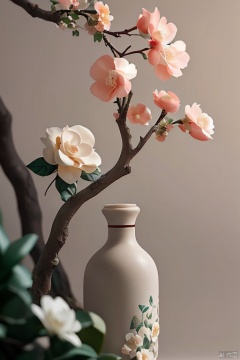 xihuwen, Beige bottle, front angle, left light and shadow, gardenia, floral decoration, petals, stone, wide-angle, e-commerce photography, high-definition, left simple branch light and shadow background