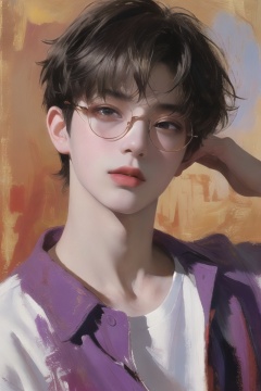 (masterpiece,best quality,ultra_detailed,highres,absurdres:1.2)),1boy, male focus,solo, simple background, upper body, purple shirt, short hair,parted lips, round eyewear,hand on own shoulder,red background, <lora:man_20240606173732-000005:0.9>((dyeing)),((oil painting)),((impasto)),