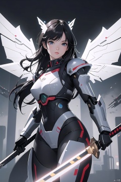 cyborg,mecha,(Best quality,masterpiece.)1girl,movie lighting, wide angle and super details,1girls,katana,mechanical_wings,mechanical_angel,armor,science fiction,