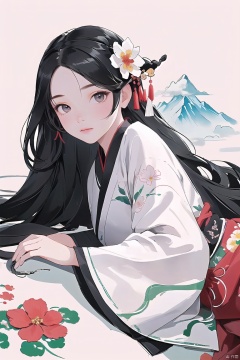best quality,masterpiece,realistic,(simple background:1.3),hair ornament,1girl,solo,black hair,long hair,mountain,cloud,(flower:1.2),upper body,wind,hanfu , hair ornament , chinese clothes,leaf,lying,(on side:1.5),ink wash painting,ink,head hold
