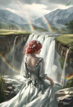 masterpiece, best quality,1girl,   realistic, solo, 1011ta dress, red hair, 1011ta, waterfall, rainbow, scenery, sky, cloud, mountain, cloudy sky, blue sky, facing away, landscape, water, green eyes, dress, medium hair, dragon <lora:wlopXLlokr4f-000187:0.95>
