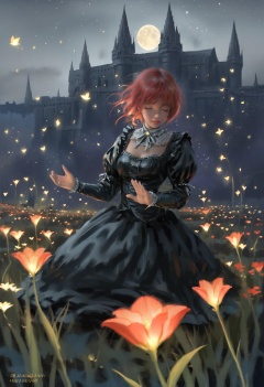 masterpiece, best quality,1girl, realistic, solo, latex, red hair, 1011ta, scenery, night, star, (sky:1.1), (sky:1.1), starry sky, night sky, praying, gothic 1011ta, star \(sky\), traditional media, castle, outstretched hand, moonlight flower, retro artstyle, flying fish, red flower, 1980s \(style\), dress, black dress, flower, outdoors, medium hair, on grass, closed eyes, gold <lora:wlopXLlokr4f-000187:0.95>