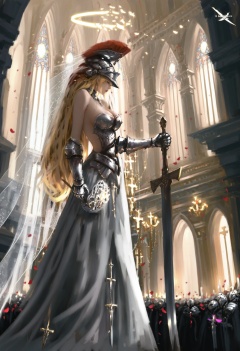masterpiece, best quality,1girl, solo, long hair, dress, holding, church, petals, helmet, veil, breasts, halo, flower, indoors, very long hair, standing, black veil, weapon, full body, from side, black dress, blonde hair, bare shoulders, purple eyes, parted lips, nun, gauntlets, candle, looking ahead, armor, sword, black flower, huge breasts, holding sword, window <lora:wlopXLlokr4f-000187:0.95>