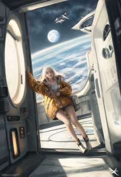 masterpiece, best quality,1girl,   realistic, solo, Outerwear, white hair, scenery, window, star, (sky:1.1), moon, open door, blonde hair, space station, blue eyes, logo, spacecraft, science fiction <lora:wlopXLlokr4f-000187:0.95>