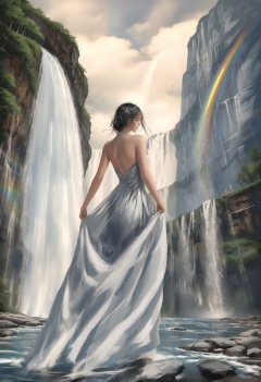 masterpiece, best quality,1girl,   realistic, solo, Skirt, Underwear, waterfall, rainbow, scenery, sky, cloud, dress, mountain, nature, water, black hair, star destroyer, long dress <lora:wlopXLlokr4f-000187:0.95>
