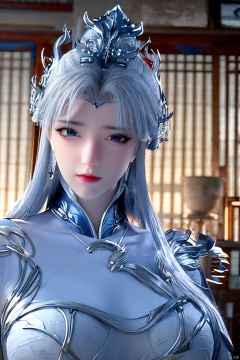 masterpiece,(best quality),official art,extremely detailed cg 8k wallpaper,(extremely delicate and beautiful),solo,realistic,photo_\(medium\),chinese clothes,blue dress,1girl,solo,blue eyes,earrings,mole,white hair,armor,crown,mole under eye,,Xningyudie