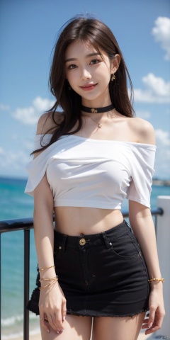 ,Short skirt,Blue sky, white clouds, ocean, nai3, 1girl, solo, crop top, , choker, navel, shirt, midriff, crop top overhang, looking at viewer, white shirt, jewelry, breasts, bare shoulders, off-shoulder shirt, off shoulder, black choker, thighs, stomach, long hair, bracelet, short sleeves, ribbon, hand up, collarbone, hair ribbon, medium breasts, , bra strap, , hair ornament, thigh gap, necklace, expressionless, , ,kind smile, ,