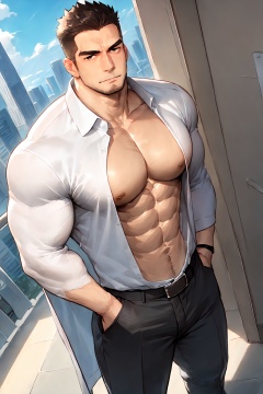 pectorals,solo,bara,male focus,large pectorals,necktie,muscular male,1boy,muscular,facial hair,blush,between pectorals,salaryman,shirt,short hair,black hair,thick eyebrows,pants,looking at viewer,formal,jacket,stubble,open clothes,belt,suit,sideburns,mature male,black pants,cityscape,white shirt,window,bare pectorals,open shirt,collared shirt,goatee,<lora:animature maleV1.0:1>,