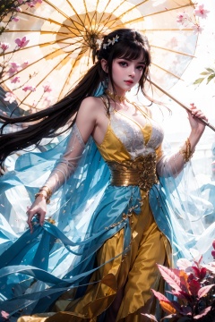 cheng,1girl,solo,(upper body:1.3),Medium boobs,large breasts,long hair,black hair,long sleeves,dress,holding,jewelry,standing,full body,ponytail,necklace,high heels,looking to the side,yellow dress,umbrella,beads,outstretched hand,holding umbrella,masterpiece,best quality,official art,unity 8k wallpaper,Brilliant colors,exaggerated art,,<lora:20240614-1718346849273:0.8>