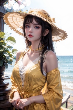 cheng,1girl,solo,(upper body:1.3),Medium boobs, large breasts,long hair,black hair,long sleeves,dress,holding,jewelry,standing,full body,ponytail,necklace,high heels,looking to the side,yellow dress,yellow skirt,sun hat,realistic,straw hat,pearl necklace,outdoors,looking at viewer,masterpiece,best quality,official art,unity 8k wallpaper,Brilliant colors,exaggerated art,,<lora:20240614-1718346849273:0.8>