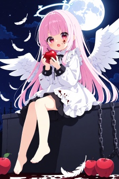 artist:mamy6o6,loli,1girl,wings,solo,halo,barefoot,long hair,food,feathers,blood,dress,feathered wings,sitting,white dress,angel wings,holding food,red eyes,blood on clothes,holding fruit,fruit,chain,angel,feet,pink hair,moon,holding,apple,blood on face,looking at viewer,toes,full moon,white wings,blush,bangs,child,very long hair,female child,night,long sleeves,full body,open mouth,cuffs,bare legs,legs,blood on hands,white hair,blunt bangs,frills,blood in hair,white