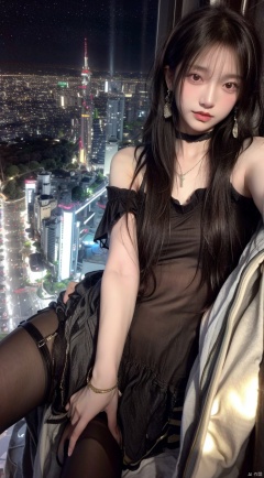masterpiece, best quality, masterpiece,best quality,official art,extremely detailed CG unity 8k wallpaper, night, real, cityscape, huge_filesize, wallpaper, album, covr, ojousama, long hair, makeup , medium breasts, revealing dress, black pantyhose, high heels, earrings, necklace, black choker , jewelry, pendant, armlet, bracelet,hand on own breasts, stretch your legs,bust