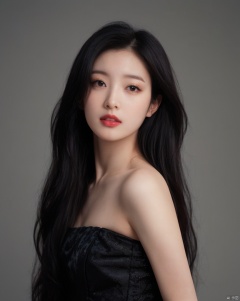1girl, solo, long hair, looking at viewer, simple background, black hair, dress, bare shoulders, upper body, grey background, black eyes, lips, strapless, realistic