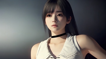 cxshenyu, 1girl, solo, choker, sleeveless, looking at viewer, black background, upper body, shirt, simple background, black choker, dark, realistic,masterpiece,best quality,(photorealistic:1.4),(ultra detailed:1.3)