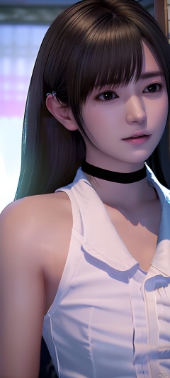 cxshenyu, 1girl, solo, sleeveless, choker, looking at viewer, shirt, sleeveless shirt, bare shoulders, white shirt, realistic, black choker, brown hair, closed mouth, realistic,masterpiece,best quality,(photorealistic:1.4),(ultra detailed:1.3)