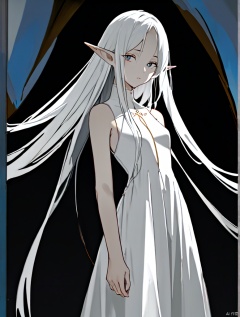 masterpiece, novel illustration, highres, A girl with white hair and long hair, wearing a white dress, standing in front of a dark background, pointed ears, long hair, dress, white dress, sleeveless, grey eyes, closed mouth, elf,