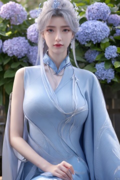 masterpiece,(best quality),official art,extremely detailed cg 8k wallpaper,(extremely delicate and beautiful),solo,realistic,photo_\(medium\),chinese clothes,blue dress,1girl,solo,blue eyes,earrings,mole,white hair,armor,crown,mole under eye,,Xningyudie,(big_breasts:1.29), Yunxiao_Fairy,X-Hydrangea, hanfu,