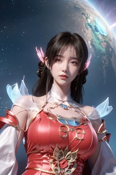 masterpiece,best quality,official art,extremely detailed CG unity 8k wallpaper,1girl, upper body,chinese clothes, above clouds, asteroid, spacecraft,  ,Xyunluo,(big_breasts:1.29),X-Hydrangea,Xlimuwan, Water_butterfly,Xcheongsam, desert_sky,girl,depth of field