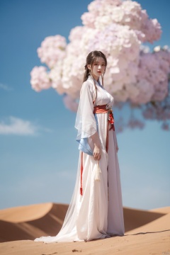 a girl,appear on camera,blue sky,blue sky,white cloud,full body,red dress,,Xyunluo,(big_breasts:1.23),Xningyudie, desert_sky,X-Hydrangea, hanfu