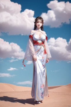 a girl,appear on camera,blue sky,blue sky,white cloud,full body,red dress,,Xyunluo,(big_breasts:1.23),Xningyudie, desert_sky,X-Hydrangea, hanfu,1girl