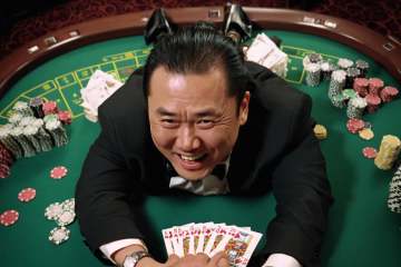 Movie shot, high angle, overhead view, noisy casino, a middle-aged man lying in a seductive position on the gambling table. He is Chinese, with a big black back, smeared with hair wax and neatly combed towards the back of his head. He wears a black shirt over his white shirt, a black bow tie, exuding a confident smile and looking at the camera. (Many chips are piled up next to him, cash is flying in front of the camera: 1.3), (many pistols are placed on the gambling table and arranged around him as the center: 1.4), close-up, a critical sense of tension, stimulation, gambling master, Revelation, cinematic feeling, rich visual hierarchy,