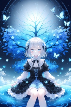 artist:nanoneko,(masterpiece), (best quality), illustration, ultra detailed, hdr, Depth of field, (colorful),This is a masterpiece that exudes exceptional quality. The illustration is ultra-detailed, utilizing HDR technology to create a sense of depth. The subject matter is an original, delicate, and beautiful artwork, vibrant with color and filled with fantastical elements. The girl is sitting by a deep sea, surrounded by flowing water, with a dull blue World Tree in the background, situated in a cemetery. The serene and dreamy atmosphere gives the entire scene a soulful and enchanting quality. Her pale complexion, azure blue eyes that glow, and silver hair adorned with flowers create a captivating portrait. She wears a Lolita-inspired fashion, expressionless with her mouth closed. The backgrounds range from white, transparent, circular options, and there are also flying translucent blue butterflies that add a sense of liveliness to the piece.