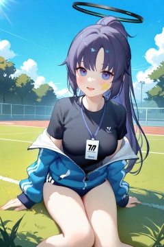 1girl,yuuka (blue archive),id card,jacket,buruma,solo,halo,official alternate costume,lanyard,breasts,looking at viewer,white background,purple hair,simple background,long hair,shirt,thighs,smile,blue jacket,partially unzipped,black shirt,ponytail,medium breasts,sitting,blue eyes,track jacket,bangs,gym uniform,sticker on face,blush,purple eyes,long sleeves,off shoulder,closed mouth,short sleeves,blue buruma,star (symbol),parted bangs,open jacket,arm support,yuukaG,yuuka, yuukaBA